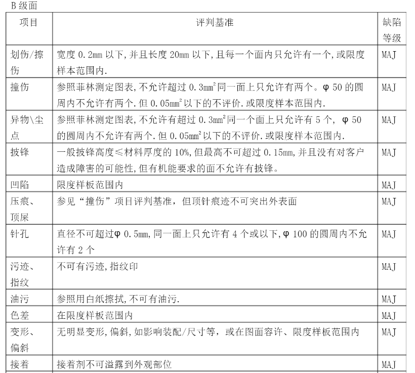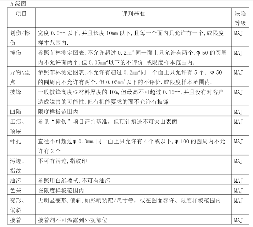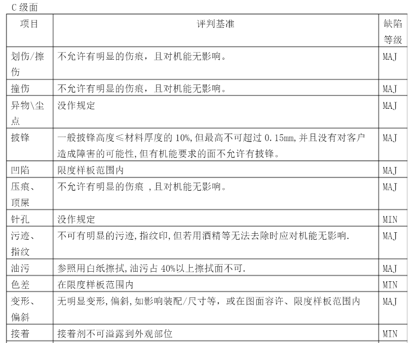五金冲压件等级要求一般分为三级,分别按A级、B级、C级下面三张图分别是五金冲压件的检测项目及三级检测要求。